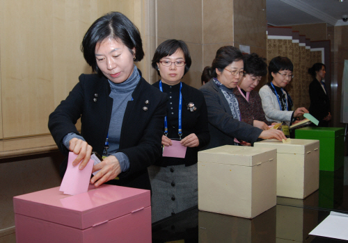 대한간호협회 새 임원진을 뽑는 선거에 참여한 대의원들이 소중한 한 표를 행사하고 있다.선거관리위원회 이영자 위원장과 위원, 회장 후보측 참관인 등이 참석한 가운데 임원선거 개표작업이 진행됐다.지난 2년 간 활동한 대한간호협회 임원들이 임기를 마치며 대의원들에게 마무리 인사를 하고 있다.대한간호협회 새 임원진이 감사의 인사를 하고 있다.대의원들은 임원들…