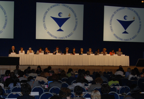 ICN 주요사업을 보고받고 의결하는 CNR 회의장.각국 간호협회 대표들이 국가 이름이 쓰인 팻말을 들어 찬성 의사를 나타내고 있다.각국 대표자들이 16개조로 나뉘어 열띤 토론을 벌였다.