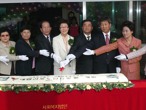 대한간호노인요양원 개원 축하 떡 절단 장면대한간호노인요양원 개원 테이프 커팅 장면