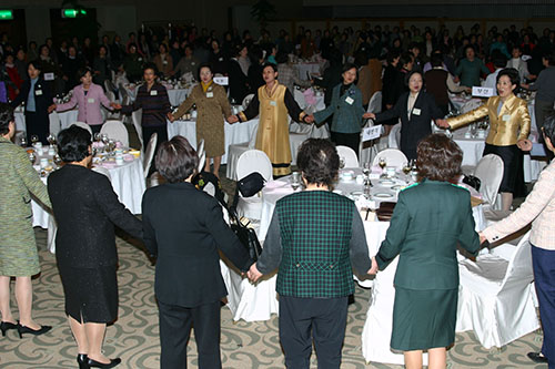 대의원 환영의 밤 행사에서 대의원들이 손에 손잡고 우정의 밤을 보내고 있다.