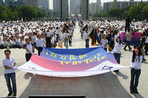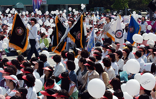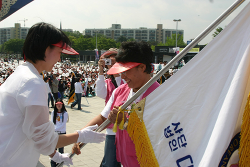 대한간호협회기와 한마음대회기, 전국 시도간호사회 및 산하단체기가 입장하고 있다한국간호의 발전과 간호사법 제정을 기원하는 1만개 풍선이 하늘을 수놓았다.대회기와 시도간호사회기, 산하단체기를 들고 입장하는 간호사들산하단체기 입장장면한마음대회기 등 깃발 전달장면간호사 한마음 대회기가 입장하고 있다.