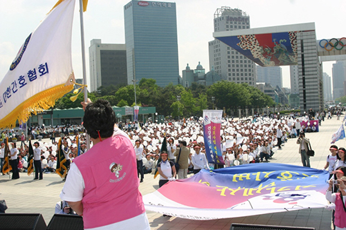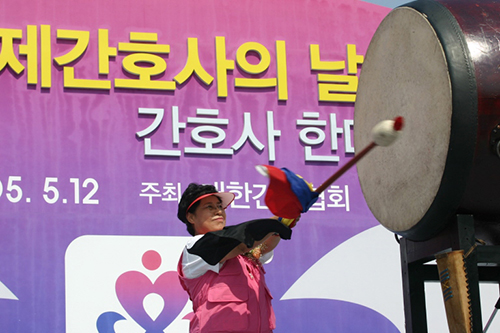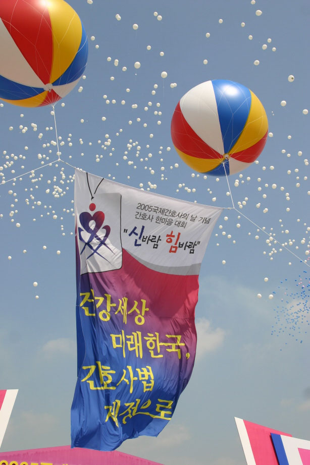 김의숙 협회장이 간호사들의 환호속에 깃발을 흔들고 있다5월의 푸른하늘을 수놓은 애드벌룬의 모습국기에 대한 경례 장면김근태 보건복지부 장관과 장하진 여성부 장관을 비롯한 여러 국회의원들이 참석했다행사에 참석한 간호사들이 환영의 박수를 보냈다김의숙 회장이 큰북을 3번 울리자 풍선들이 떠 올랐다