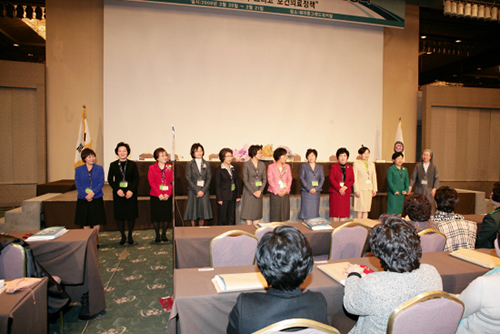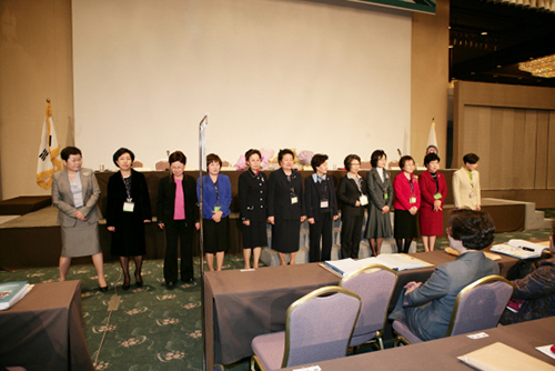 김조자 회장이 신경림 신임회장에게 회장메달을 걸어주며 축하하고 있다.그동안 수고한 구 임원들에게 박수를 보내고 있는 모습선거에서 선출된 2008-2009 신임 임원들제32대 회장으로 당선된 신경림 회장, 김용순 제1부회장, 박호란 제2부회장