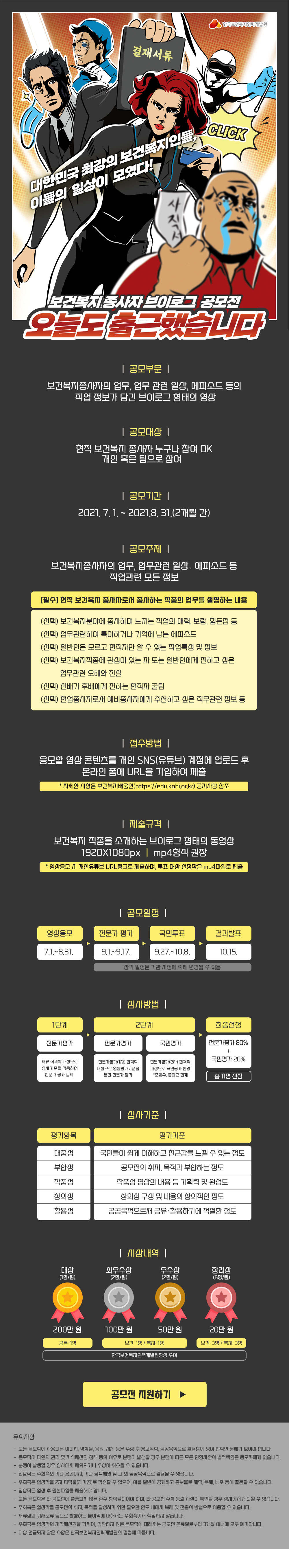 | 274 | 공지 | [한국보건복지인력개발원] 보건복지 종사자 브이로그 공모전 안내 |