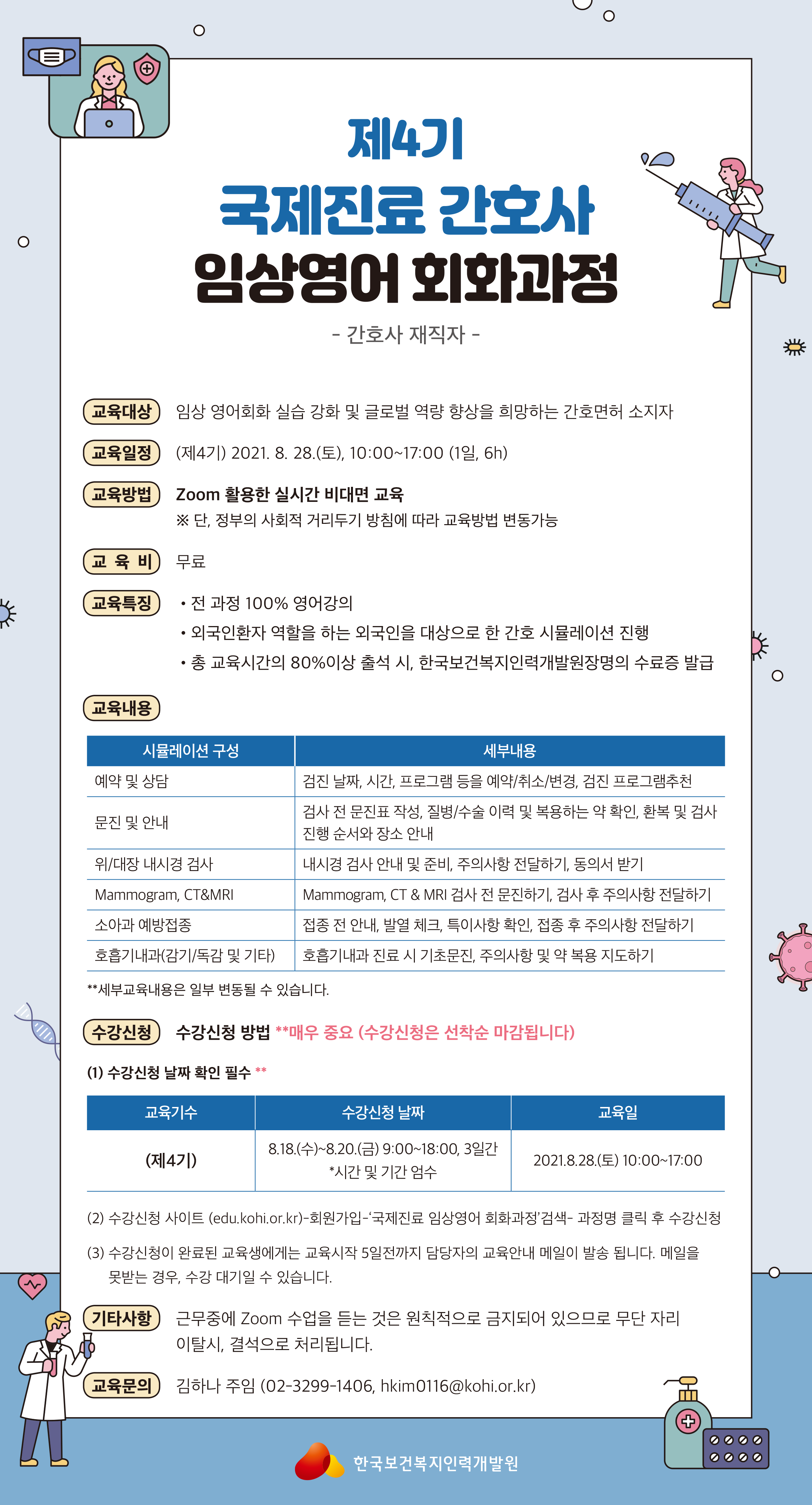 | 277 | 공지 | [한국보건복지인력개발원] 제4기 국제진료 간호사 임상영어 회… |