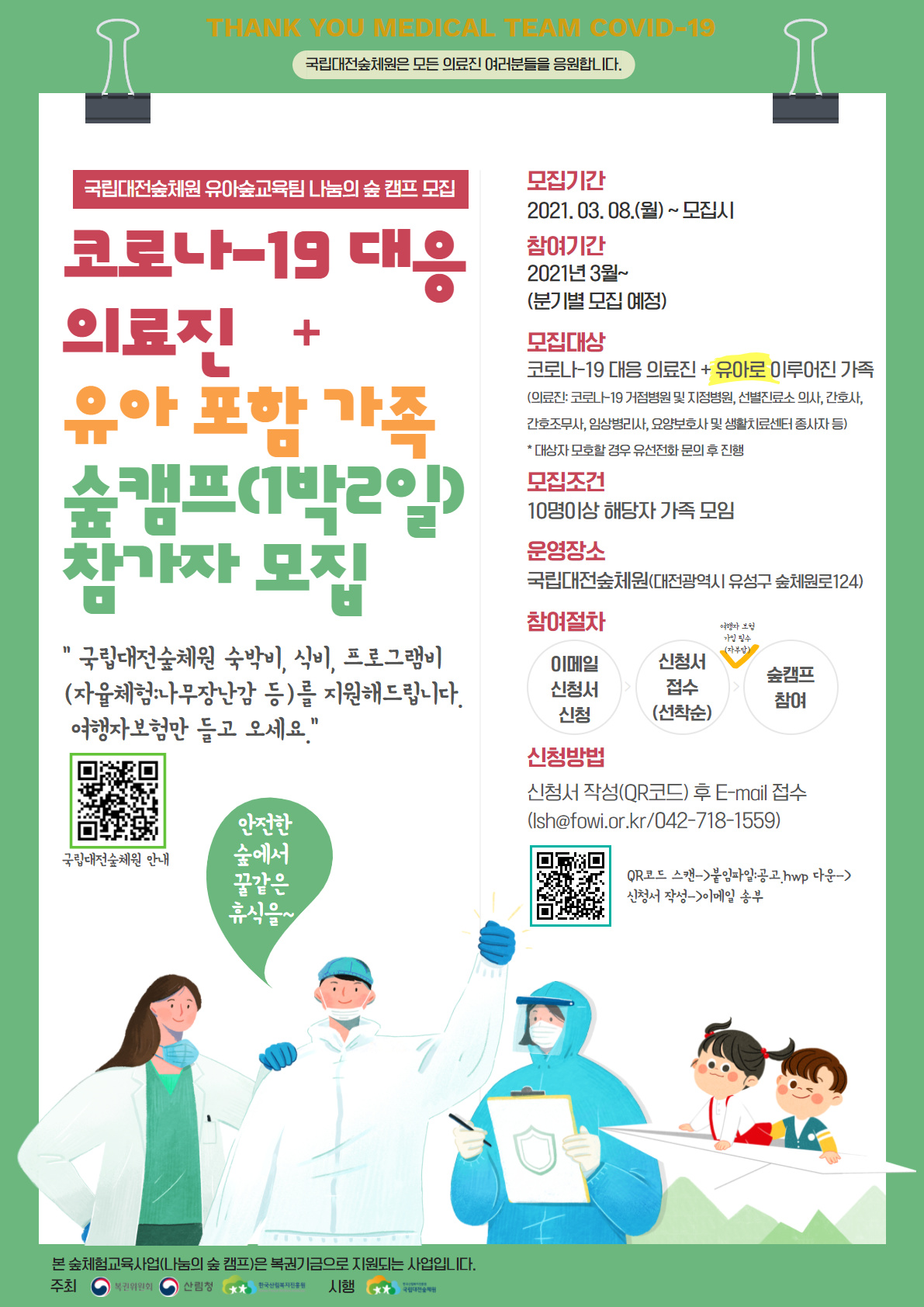 | 264 | 공지 | [국립대전숲체원] 코로나19 대응 의료진 가족을 위한 유아 … |